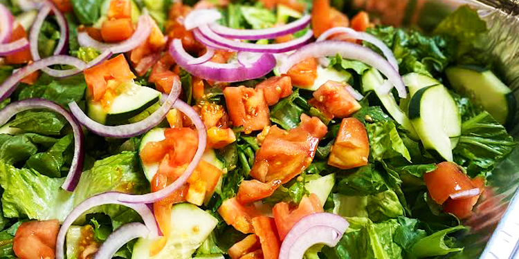 Fresh lettuce, feta cheese, onion, black olives, tomato, cucumbers, pepperoncini and anchovies (optional).