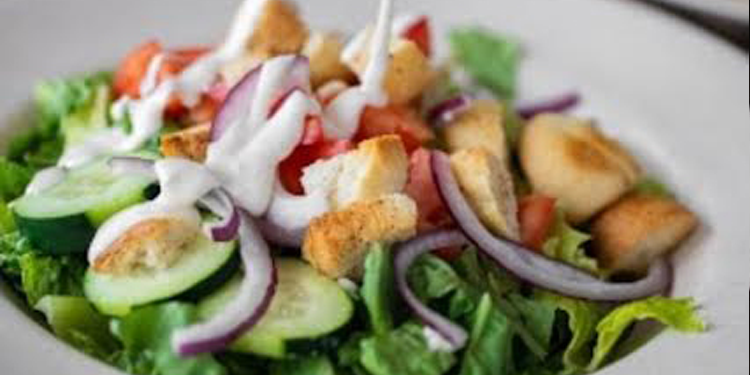 A bed of lettuce topped with cucumber, tomato and croutons. Served with Caesar dressing and romano cheese.